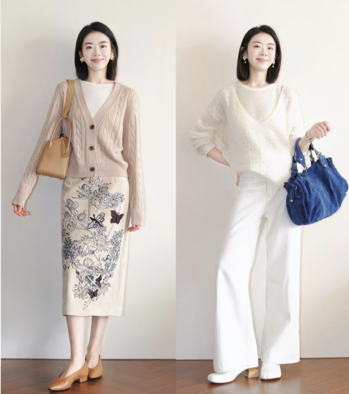 如果你喜欢干净大方的打扮,可以尝试一下白色的针织单品,下装搭配白色裤子或者奶茶色这类暖色系,都是不错的选择。